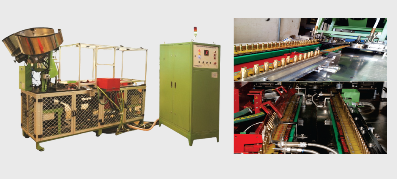 Component conveyor feeds components to induction annealing coil. Components are rotated while passing through induction coils to anneal cartridge uniformly. IGBT resonant inverter based induction inverter delivers stable High frequency heating power to the Induction coil.